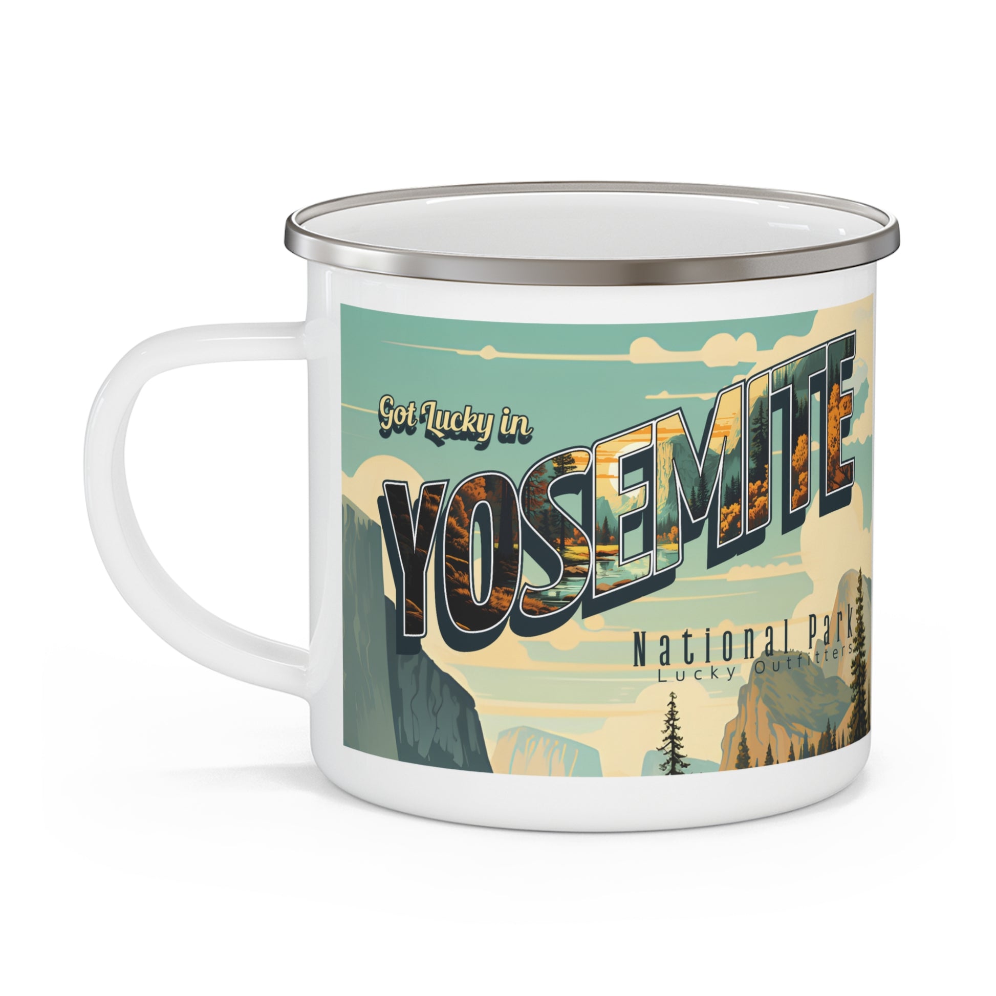 Got Lucky in Yosemite Enamel Camping Mug — 'Lucky Outfitters' Retro Outdoor Travel Cup