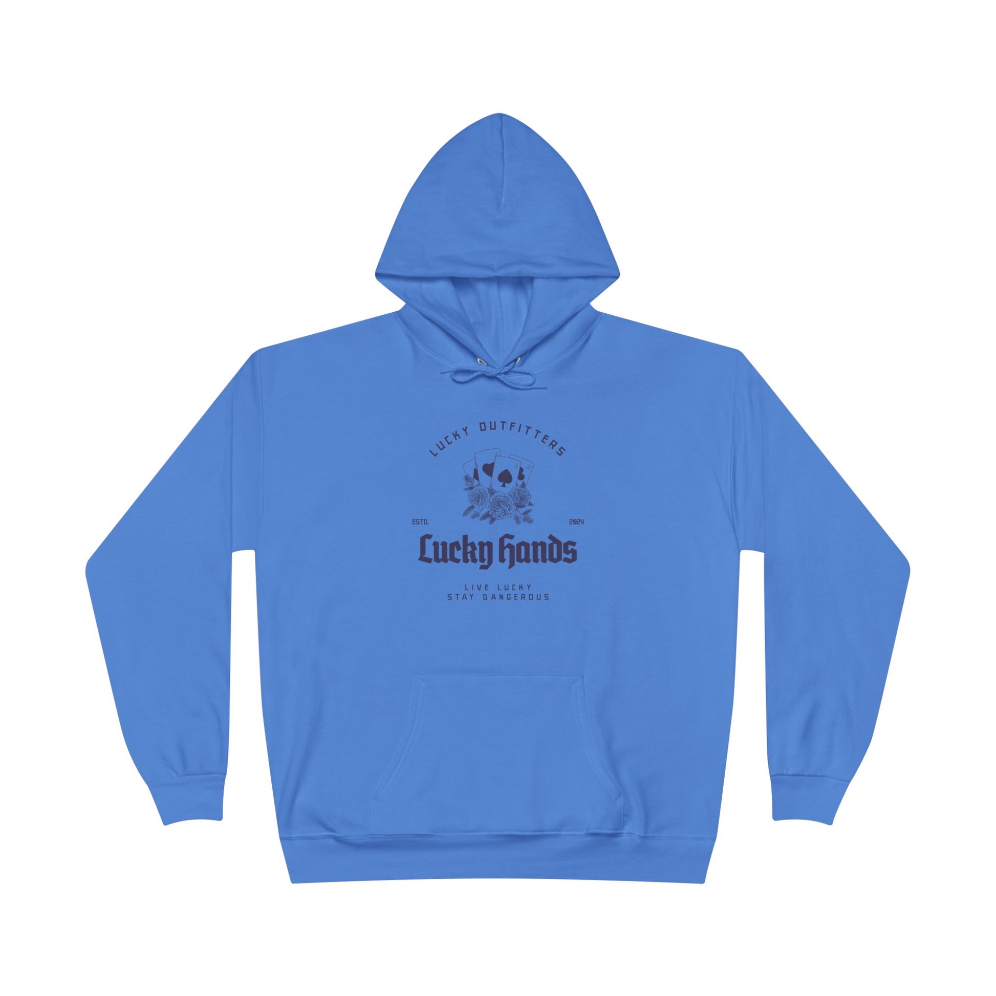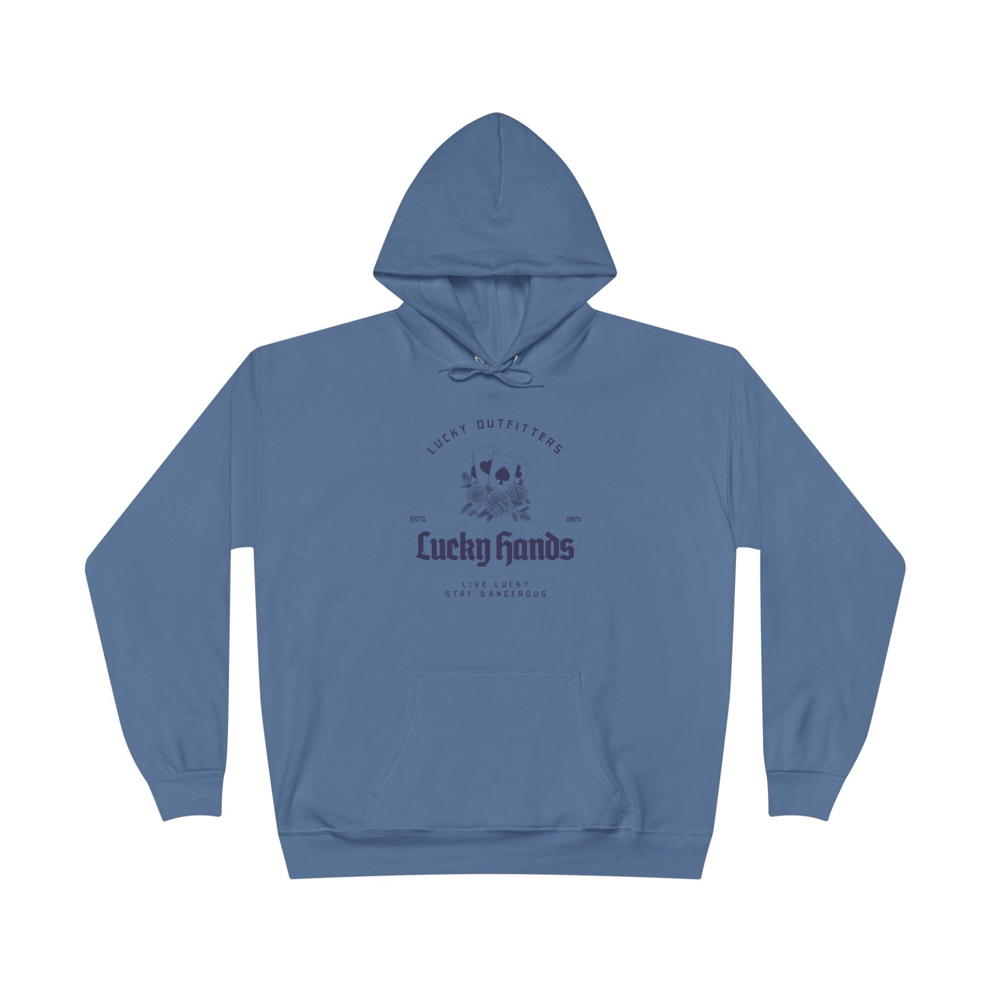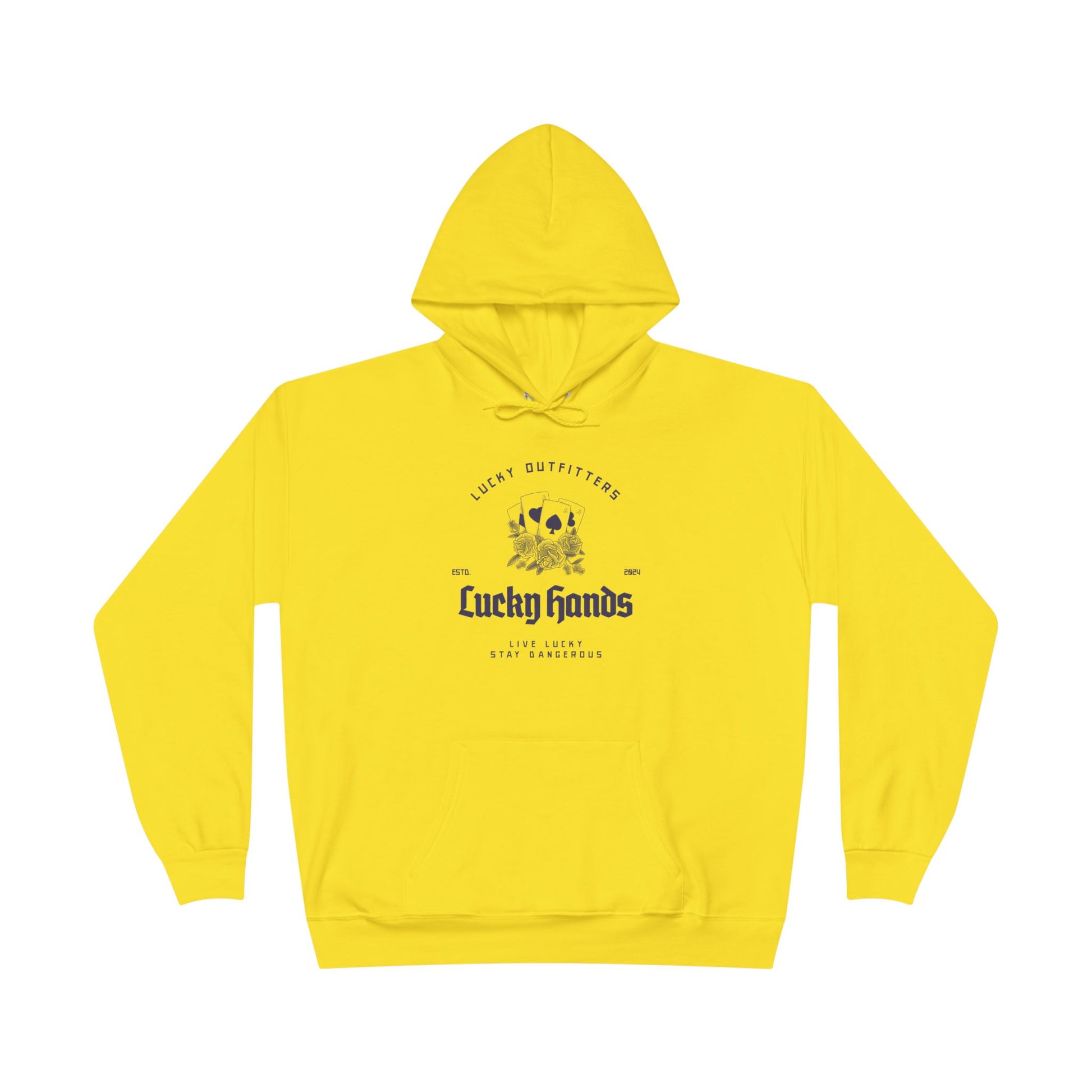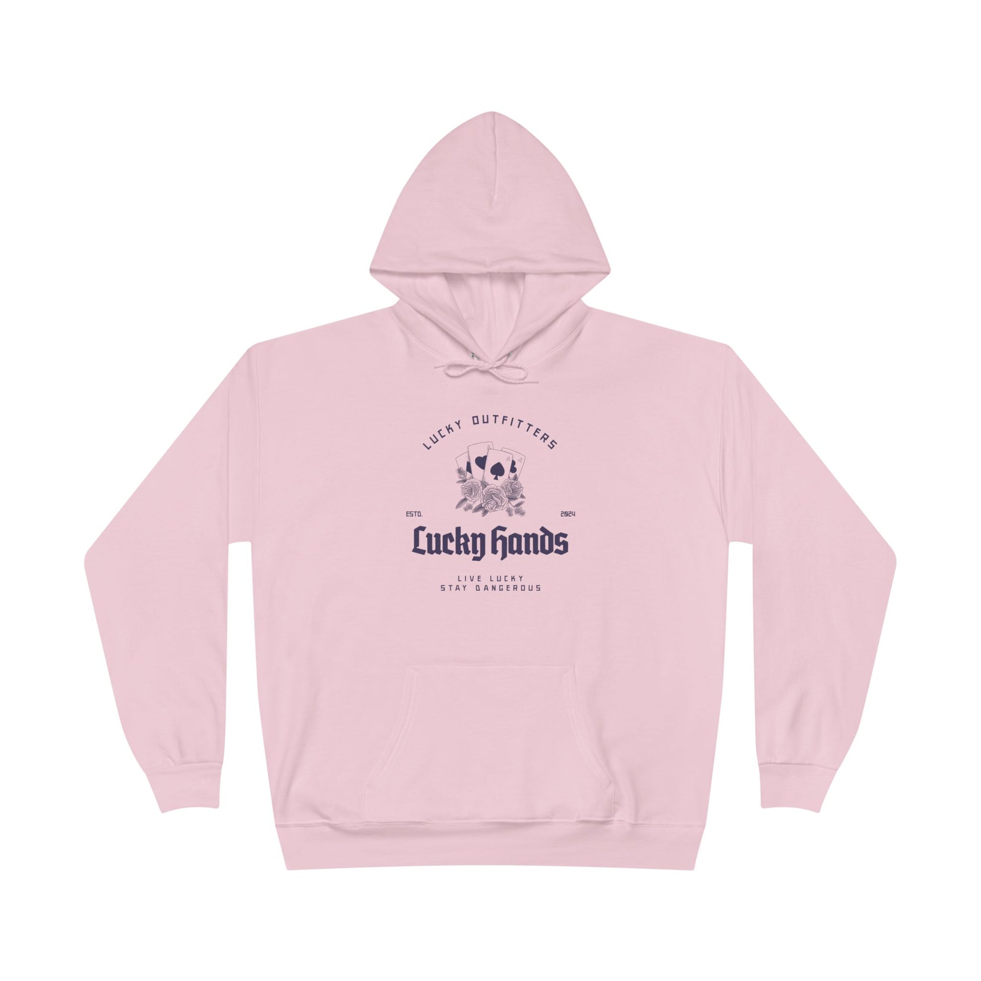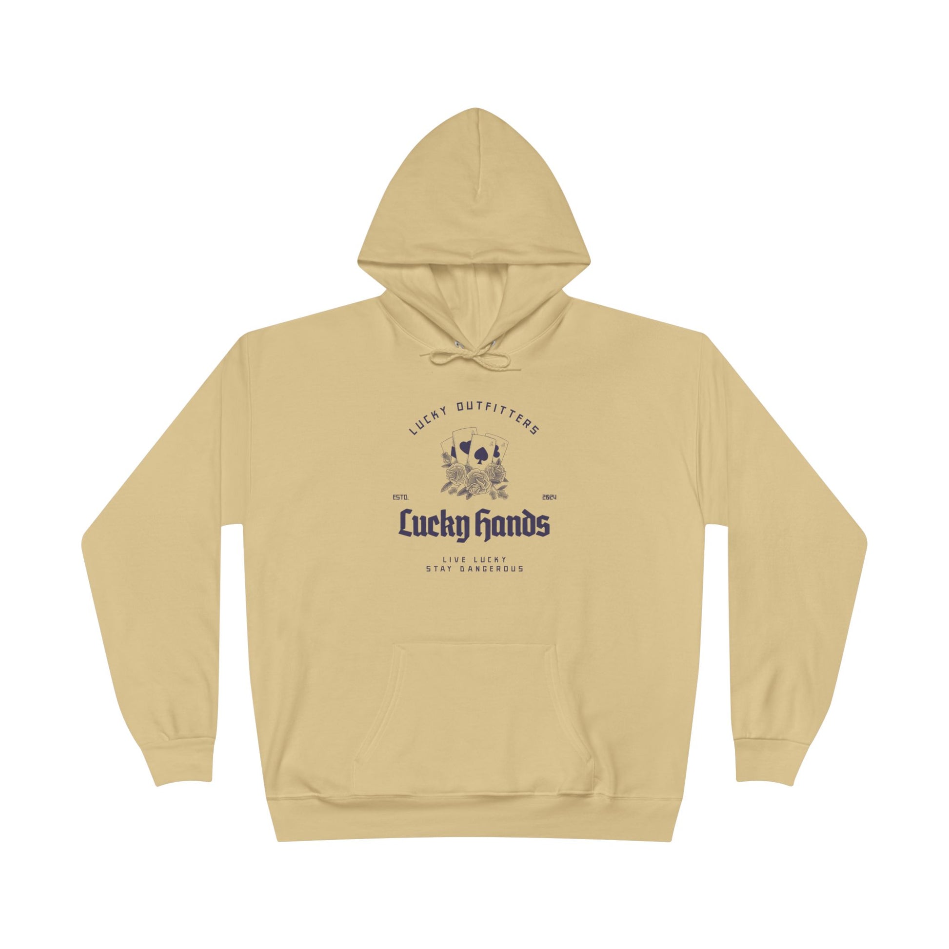 The Lucky Hands Hoodie features a striking graphic of four aces, stacked and shining like a winning hand you weren’t supposed to pull… but did anyway. Centered beneath the cards is the bold title “Lucky Hands”, with the mantra “Live Lucky, Stay Dangerous” printed below in clean, subtle lettering for that perfect edge.